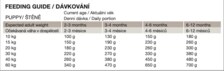 : Jídlo podávejte suché, nebo zalité vodou. Po úvodním období krmte svého psa denními dávkami podle hmotnosti psa na tabulce. Doporučená denní porce je pouze orientační. Množství denního krmiva závisí na kondici a věku psa. Pokud má pes nadváhu, snižte denní porce o 10 %. Pokud má pes podváhu, zvyšte denní dávku o 10%. Vždy by měla být k dispozici čistá, čerstvá voda. Skladujte na suchém místě.