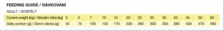 : Jídlo podávejte suché, nebo zalité vodou. Po úvodním období krmte svého psa denními dávkami podle hmotnosti psa na tabulce. Doporučená denní porce je pouze orientační. Množství denního krmiva závisí na kondici a věku psa. Pokud má pes nadváhu, snižte denní porce o 10 %. Pokud má pes podváhu, zvyšte denní dávku o 10%. Vždy by měla být k dispozici čistá, čerstvá voda. Skladujte na suchém místě.