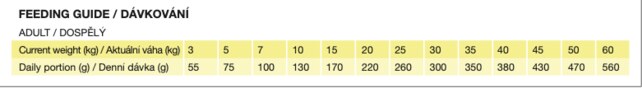 NÁVOD K POUŽITÍ: Jídlo podávejte suché, nebo zalité vodou. Po úvodním období krmte svého psa denními dávkami podle hmotnosti psa na tabulce. Doporučená denní porce je pouze orientační. Množství denního krmiva závisí na kondici a věku psa. Pokud má pes nadváhu, snižte denní porce o 10 %. Pokud má pes podváhu, zvyšte denní dávku o 10%. Vždy by měla být k dispozici čistá, čerstvá voda. Skladujte na suchém místě.