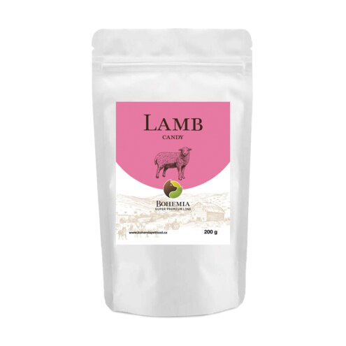 poloměkké pečné pamlsky s jehněčím masem ve tvaru malé morkové kosti.