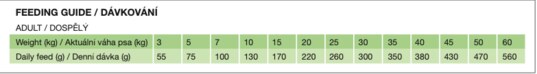 : Jídlo podávejte suché, nebo zalité vodou. Po úvodním období krmte svého psa denními dávkami podle hmotnosti psa na tabulce. Doporučená denní porce je pouze orientační. Množství denního krmiva závisí na kondici a věku psa. Pokud má pes nadváhu, snižte denní porce o 10 %. Pokud má pes podváhu, zvyšte denní dávku o 10%. Vždy by měla být k dispozici čistá, čerstvá voda. Skladujte na suchém místě.